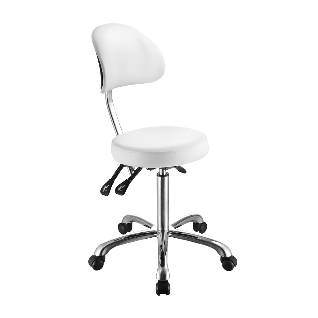 Estofamento em PU branco de alta qualidade e base cromada com 5 rodas muito estáveis.