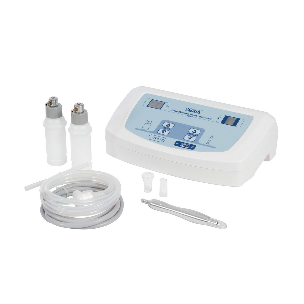 O equipamento completo inclui: a unidade de controle com um temporizador para regular a duração dos tratamentos, 2 tanques de pulverização, 1 peça de sucção, tubos para os tanques e a peça de mão, 3 cabeças de sucção e filtros de esponja.