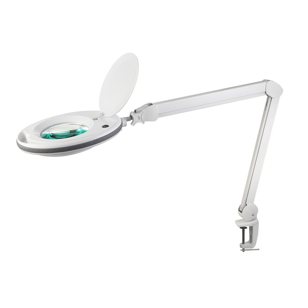 A lupa é um modelo de mesa cuja lupa possui 5 dioptrias. Destaca-se também pelo design da luminária com LED SMD. Oferece 8 W de potência e atinge um ângulo de iluminação de 360 graus.