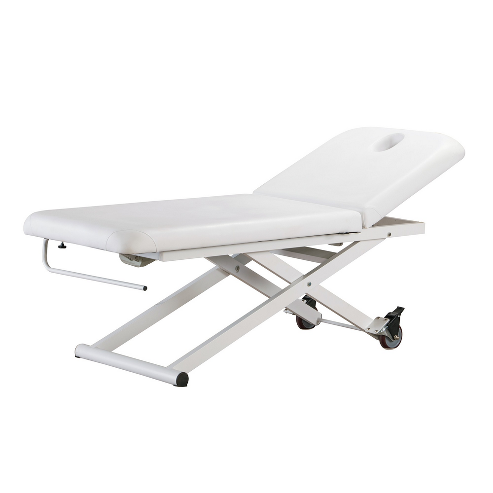 Esta mesa de massagem elétrica é alimentada por um motor que regula a altura através de um botão de controle. Possui encosto reclinável cuja posição pode ser inclinada em até 60º através de um pistão a gás. A espessura da espuma que o cobre é de 7,5 cm. É estofado em PVC branco, durável e resistente. Possui orifício facial e almofada para apoio de cabeça.