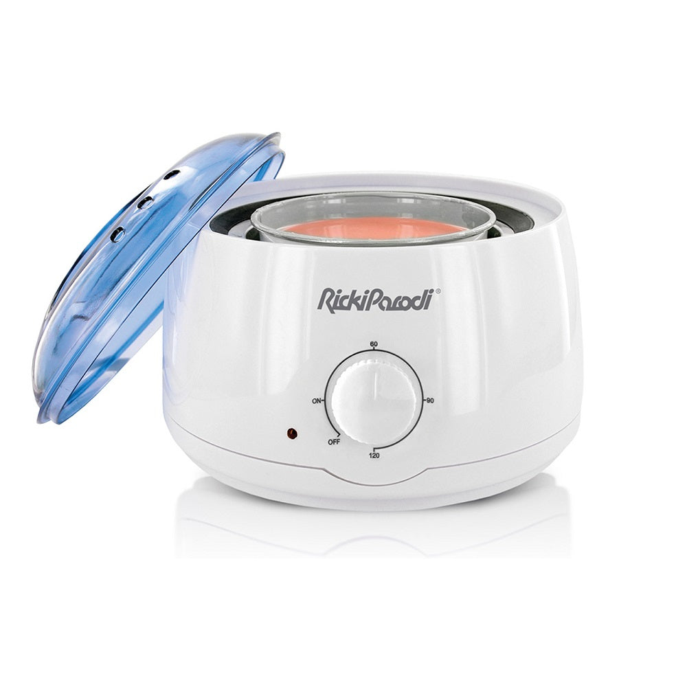 Inclui recipiente de metal amovível com pega e tampa (com dissipadores de calor), para prevenir contaminação da cera.